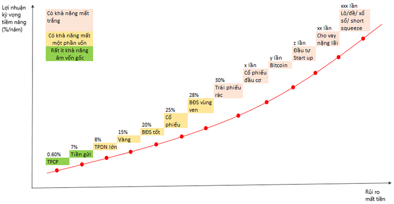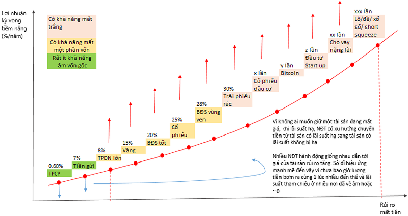 Là 1 NĐT, bạn có nhiều lựa chọn dùng tiền của mình. Nếu tôi gửi tiền được 7%/năm, logic nếu tôi đầu tư vào tài sản rủi ro hơn thì tôi cần yêu cầu một lợi nhuận cao hơn. Tài sản càng rủi ro tôi càng cần yêu cầu một lợi nhuận cao lên để bù đắp cho rủi ro tôi có thể chịu.