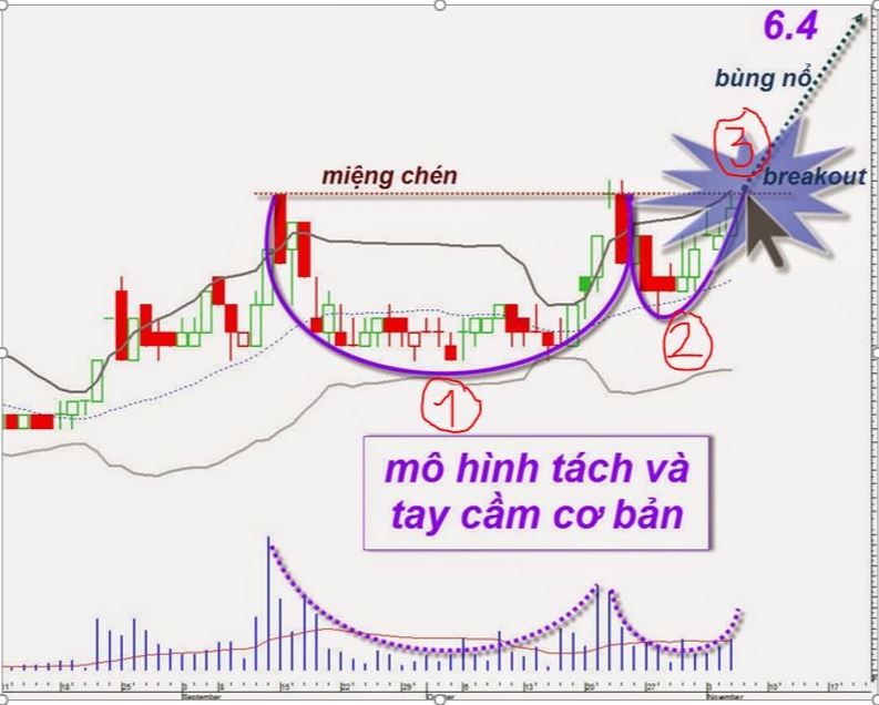 Lại nói 1 cách nôm na để các bạn hiểu, thì các mẫu hình này được tìm ra dựa trên sự phân tích các biến động giá và khối lượng trong quá khứ. Tức là cứ khi giá và khối lượng tạo thành 1 hình mẫu biểu đồ như thế này, thì tương lai giá sẽ biến động như thế kia. Ví dụ pattern kinh điển cup and handle ở hình dưới, thời điểm mua tốt nhất là khi đồ thị giá tạo xong cái handle (tay cầm của cái cốc) và break out ra khỏi cái miệng chén (điểm số 3 trong hình minh họa bên dưới).